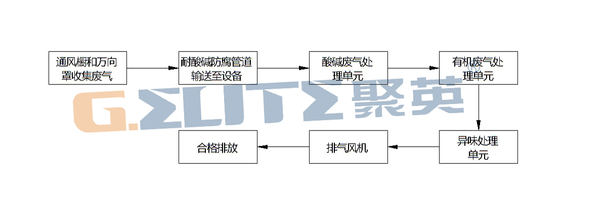 備注:以上工藝流程是廢氣綜合處理的工藝,針對不同的廢氣將采用不同處理工藝。